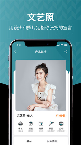 2、海量产品预览:全面展示文艺照、证件照、亲子照、轻婚纱等多样套系。每套产品配有高清样片,详细说明服装、化妆、修图、打印等服务内容,提前了解拍摄效果 。