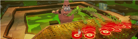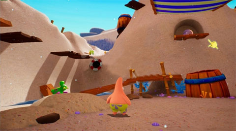 3、游戏中,玩家的主要收集物品分别为颜色各异的小亮片,派大星的袜子和金色厨师铲三种。这些颜色各异的小亮片散布在各个区域的道路与角落中,随着颜色的递进来决定稀有度与获取难易度,同时击败邪恶机器人也会掉落数量不一的小亮片。玩家可以用小亮片来解锁额外的区域与挑战,或是交予蟹老板来换取金色厨师铲。金色厨师铲亦可以用来解锁游戏中的新区域,但是获取难度最大,往往需要击败BOSS或完成解谜才能获取。而派大星的袜子则隐藏在游戏中比较难以到达的地方,需要玩家细心去探索,同样也可以交予派大星用来交换金色厨师铲。