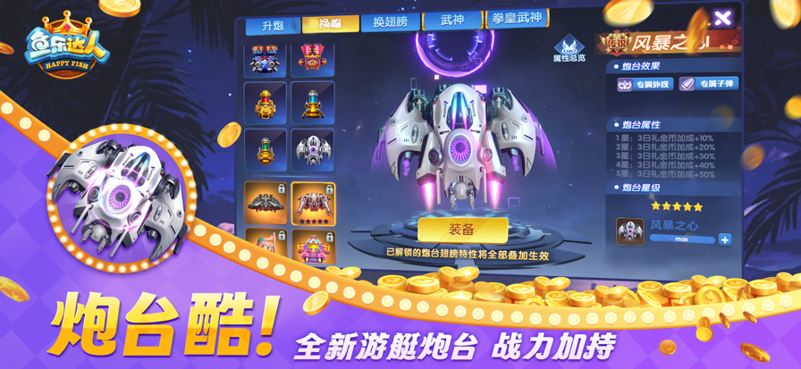 鱼乐达人官方正版增加了炮台种类以及大量的角色种类,不同的炮台、角色都有独特的属性加成,可以让你的打鱼之路更加轻松,同时还有全新的翅膀以及炮台时装,让你成为房间中最靓的仔!此外还有热力四射的魅夜九尾狐、风情万种的美人鱼、神秘尊贵的神龙太子、坐拥万金的史前巨鳄等全新BOSS等你来挑战!