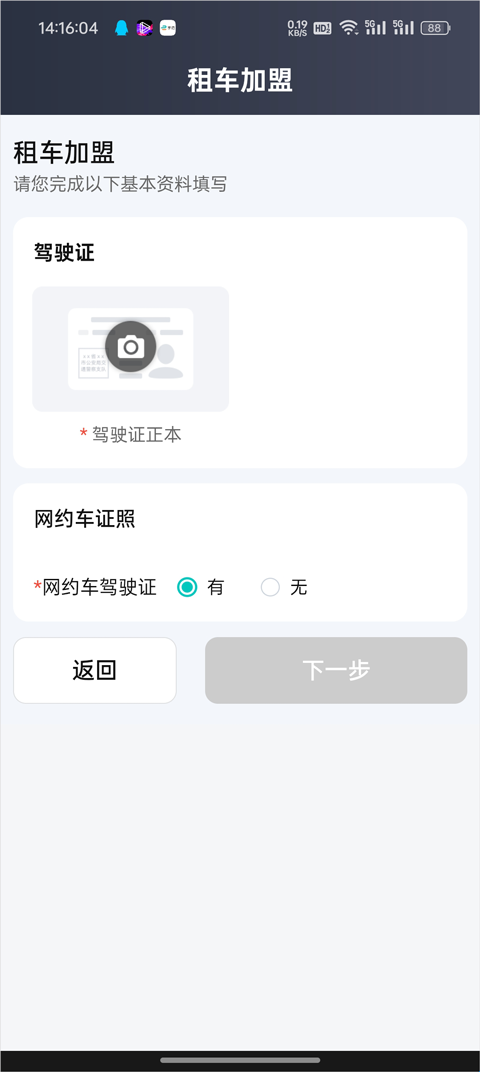 2、系统会提供两种加盟方式:带车加盟和租车加盟,可根据实际情况选择,这里以租车加盟为例。