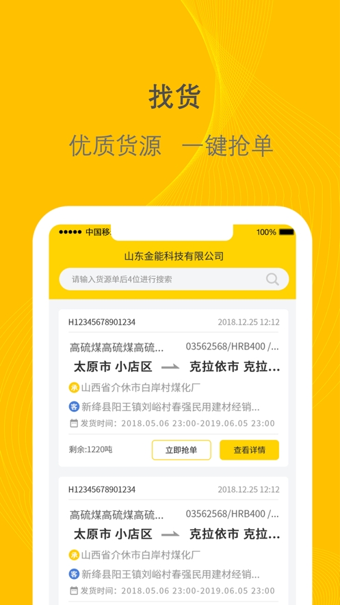 3. 点击上方的【找货】模块,进入货源大厅。页面展示可抢单的任务内容,点击“立即抢单”即可加入运输排程。