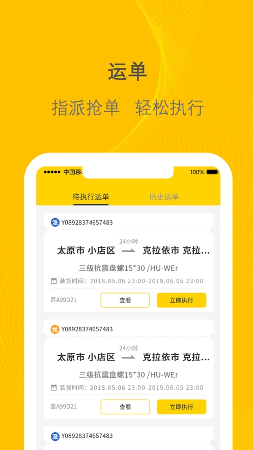 2、支持用户快速获取运单,指派抢单,轻松执行。