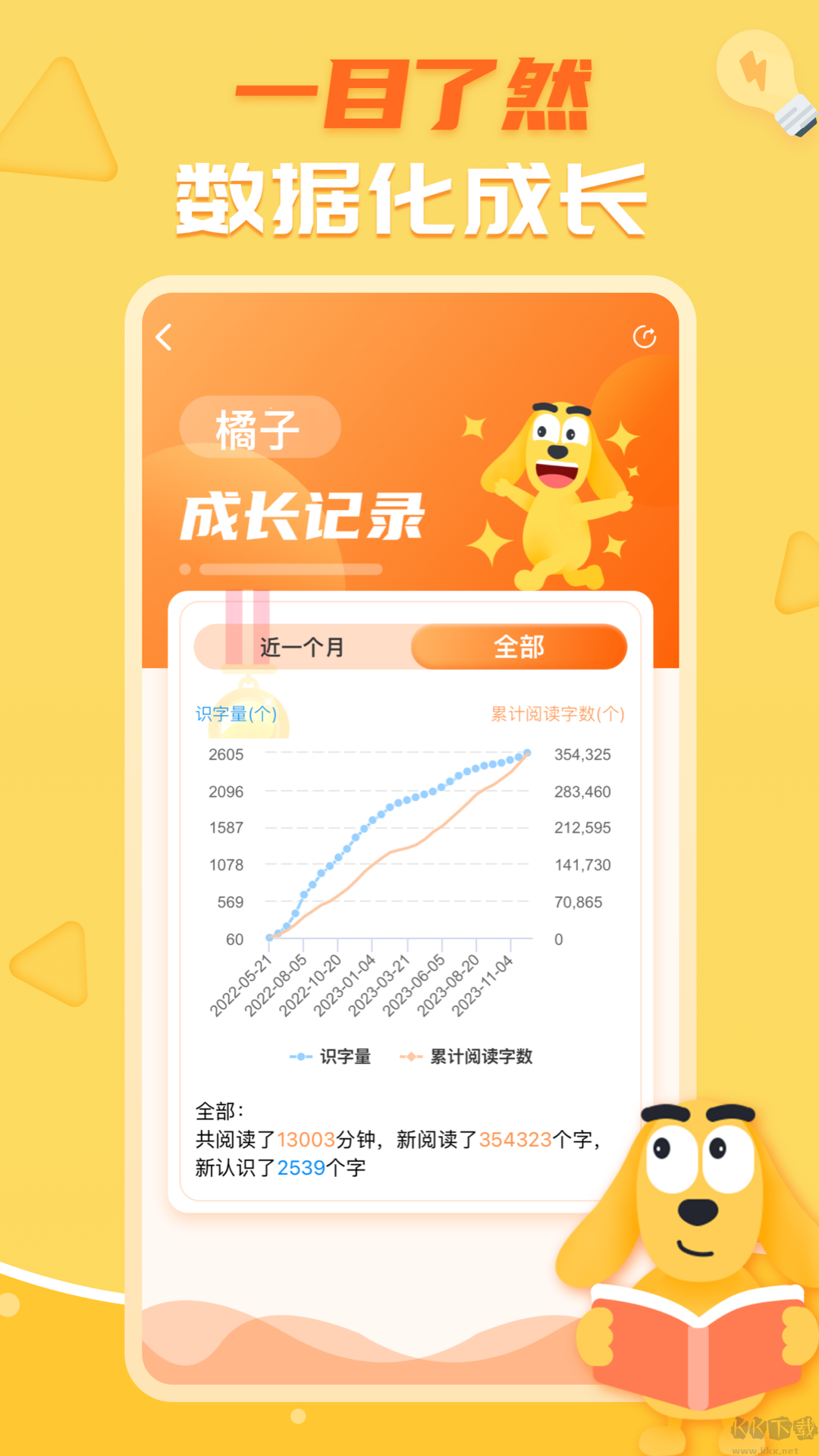5、量化学习曲线,进步清晰可见:软件自动生成识字量和阅读时间曲线,家长看见进步,宝宝获得动力
