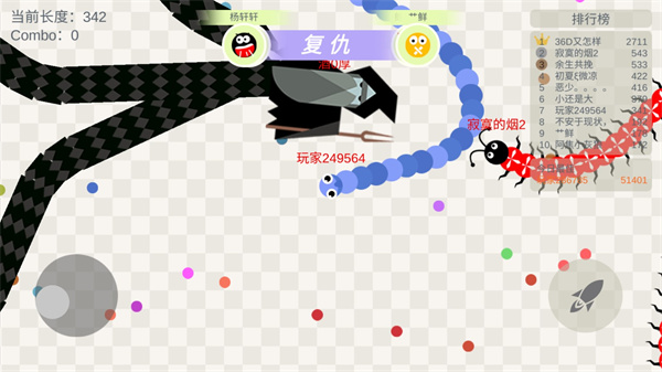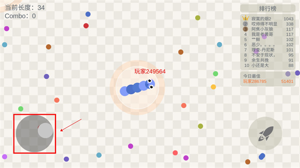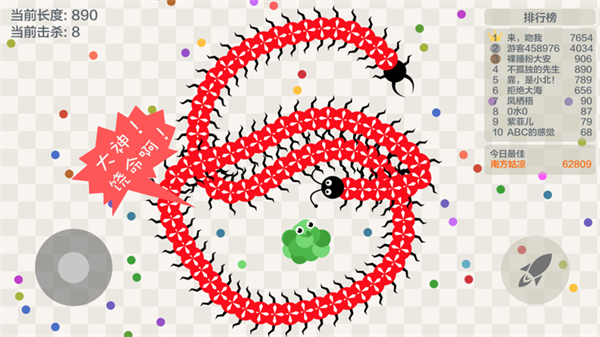 2、拖动摇杆控制小蛇的方向,吃掉地图上彩色的小豆豆,不断的变长;游戏采用经典的贪吃蛇玩法,我们要不断地增加长度,去击败其他玩家