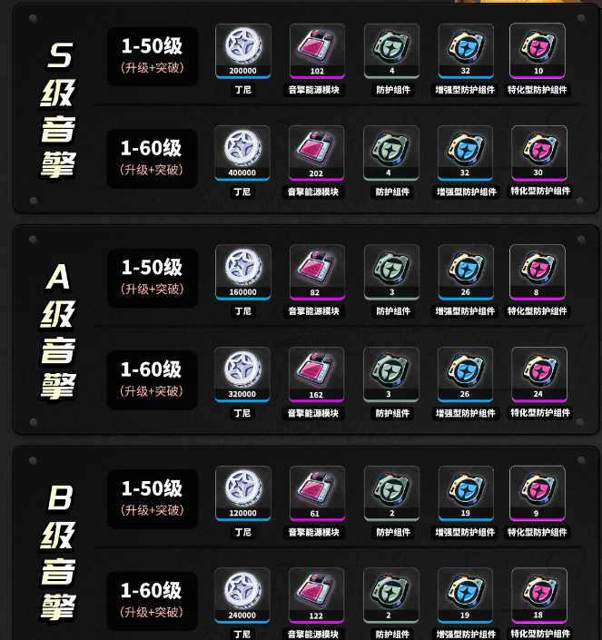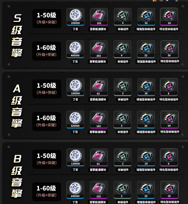 仪玄/潘引壶角色养成材料与音擎养成,音擎包含S/A/B级材料,小伙伴可根据自身需求进行选择。