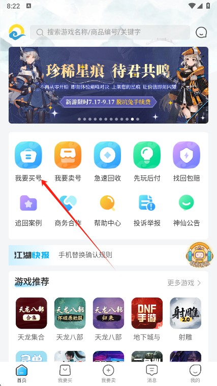我要买号、我要卖号、神仙问答、交易须知、找回包赔、神仙公告、企业资质、联系客户,黑号查询;