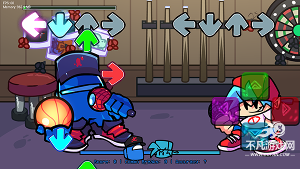 5、正式进入游戏后,游戏的玩法有点类似QQ炫舞,地下会弹出对应的方向音符,我们需要控制方向键点击对应的音符,底部有进度条谁能把对手逼到底线即可赢得胜利;