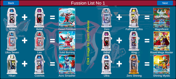 4、点击Fussion List”,即可查看不同胶囊所能合成的奥特曼种类;