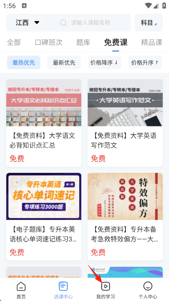 2、点击屏幕上方的“免费课”。