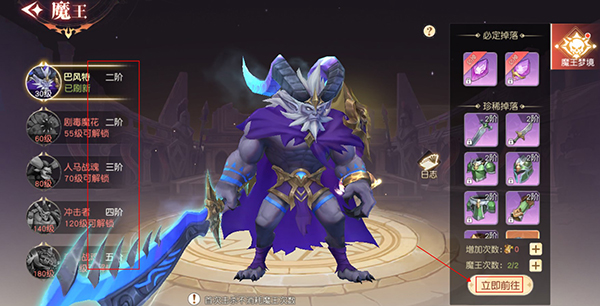 5、游戏内设置了多个等级的魔王BOSS,玩家能够对其发起挑战。每天玩家可免费参与挑战两次,若使用特殊道具,还能够额外增加挑战次数。一旦成功击败魔王,玩家就可获取强化石以及稀有装备。而且,BOSS的阶级越高,玩家所能获得的奖励也就越丰厚。