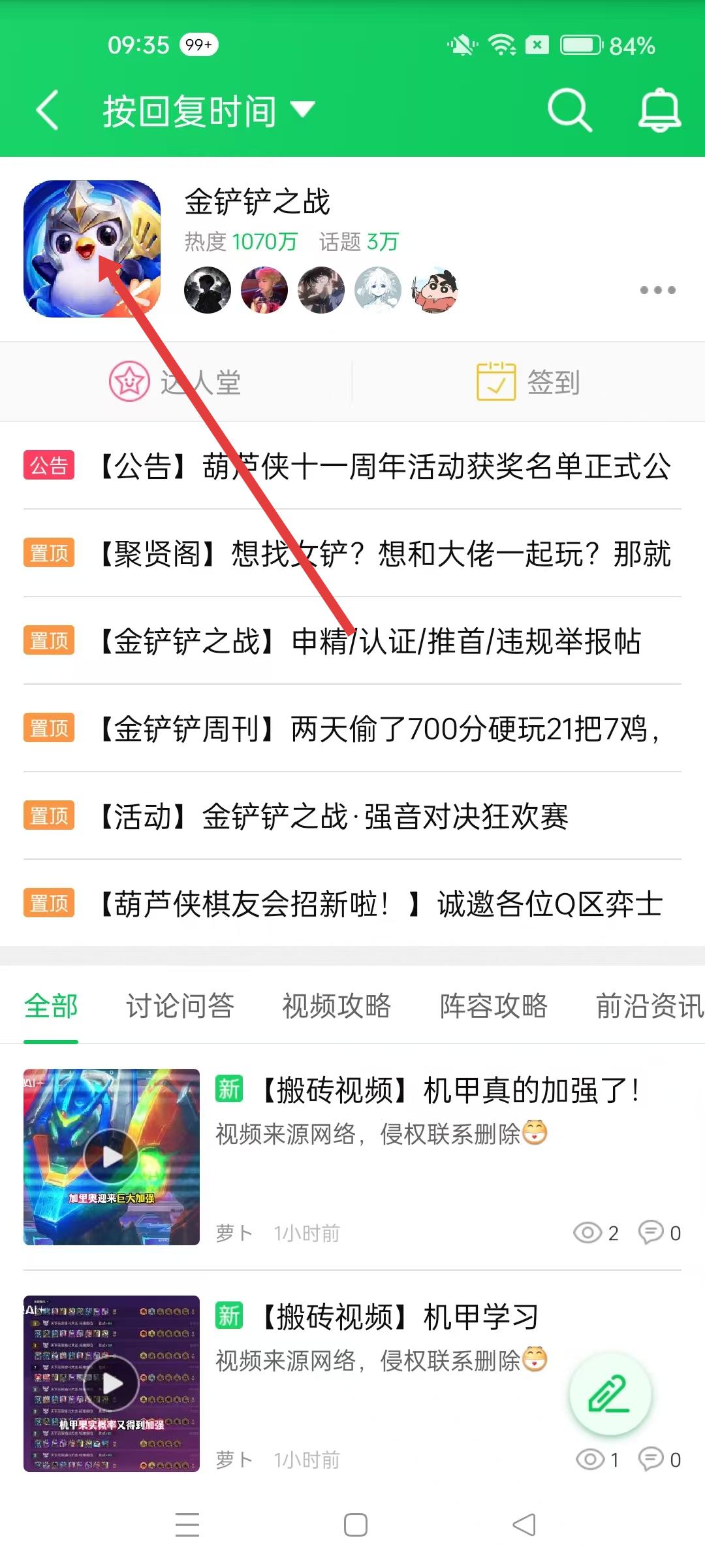 2、进入社区后,选择金铲铲之战板块,可进入该游戏的话题页面,查看公告、置顶帖等内容。