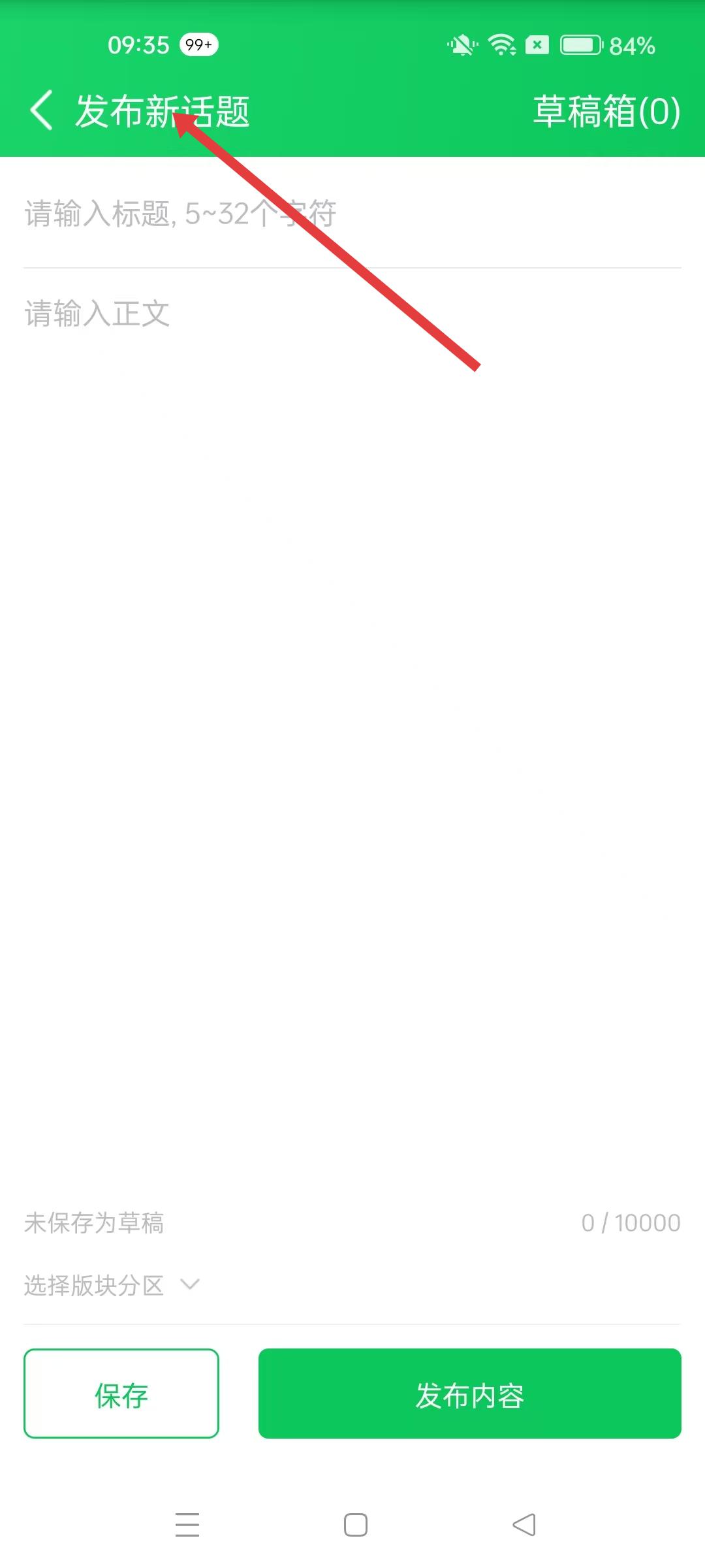 4、进入发布新话题页面,输入字符的标题和正文,选择版块分区后,可保存或发布内容。