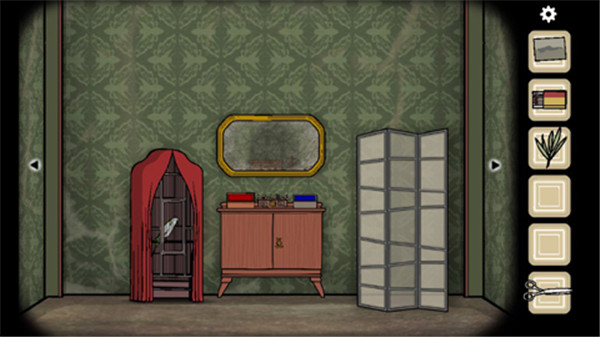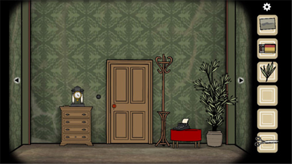 2、柜子上有个复读机,看来是放磁带的。旁边有打字机。还有一株植物。用剪子可以剪下来树叶。还有门旁边的开关开灯。灯里面有照片碎片。