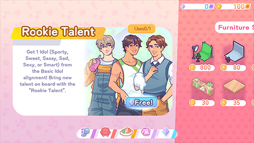 7、虽然免费的装饰简单,但可以通过移动已有物品来改善房间布置。如果练习生精力不足,前往美食店购买食物补充能量。