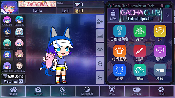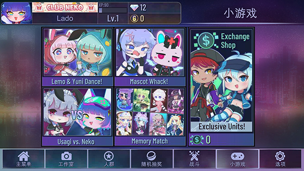 2、游戏分为主菜单、工作室、人群、随机抽奖、战斗、小游戏和选项栏目,