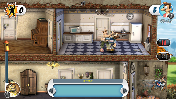 这关比较简单,先按提示拿热水袋,顺便拿右边箱子里的橡皮筋,然后上去按提示放热水袋,躲到烟囱里,等老头被他母亲打PP后,到左上,捡起玩具兔和有虱子的毛巾,然后在左上工具箱拿万能胶,等老头离开左下后,到左下,对楼梯旁的标枪使用橡皮筋,把玩具兔放到架子旁边的玩具箱上,然后到右下,使用有虱子的毛巾,然后老头离开右上后就马上上去,对放爆竹的箱子使用万能胶,然后马上下去或者躲到烟囱里,收工。