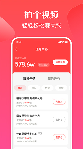 度小视怎么领任务?用户可以在平台上领取各种任务,完成之后会获得钻石奖励,1000钻石可以变现为1元。