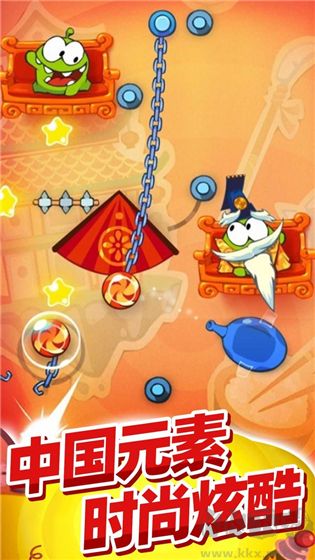 1、益智解谜,在游戏中,玩家需要结合关卡内的道具,将绳子割断后,让糖果掉落到我们两个可爱的小奥姆嘴中,并且在糖果掉落的时候,尽量将空中悬浮的星星收集,获取更高的通关分数。