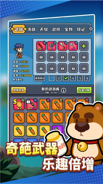 2、解压冒险:玩家可以在游戏中体验到轻松愉快的冒险过程,通过打怪、爆装备、合成武器等方式来释放压力。