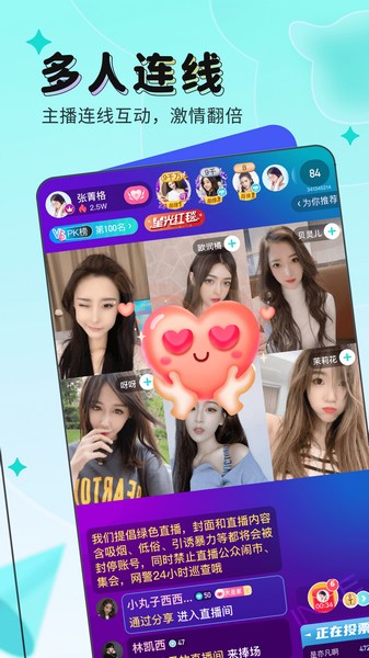 支持单人直播、多人连线PK(团战、才艺比拼、游戏互动),新增「全景K歌」「约会派对」等玩法,增强沉浸式体验