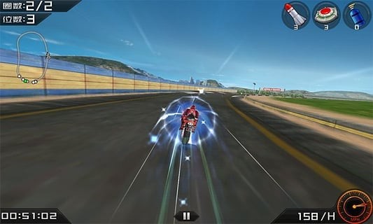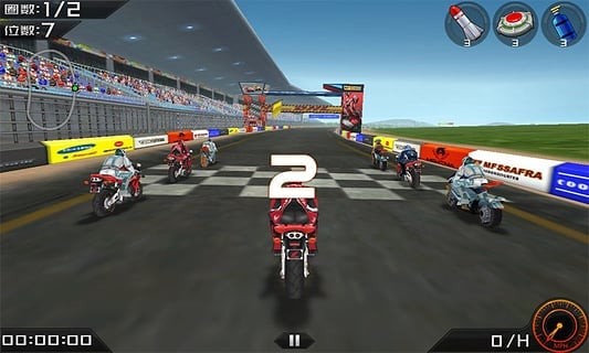 4、超车, 刚开始时会摩托有点落后,按住向前键不放,摩托会自动加速,不一会儿,就会跑在前几名。