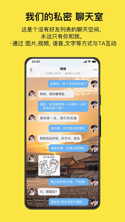 腻歪有情侣专属的即时通信功能,有情话想说时可以一步抵达,不再需要繁琐的通讯录选取和尴尬的信息发错,并且统计情侣聊天的全部字数和语音长度,再回首时成就感和甜蜜感满满。