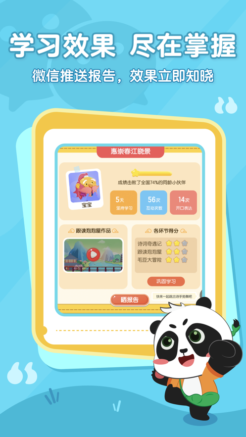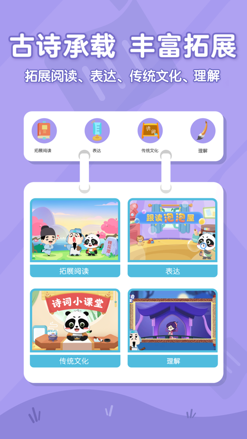 4、趣味学习,摆脱传统背诵古板教学方式,通过看动画、听儿歌的方式增长知识,趣味性的去背诵朗读古诗,容易掌握 。