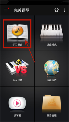 1. 打开完美钢琴应用,首先看到的就是首页界面,在这个页面上,轻轻点击“学习模式”选项。