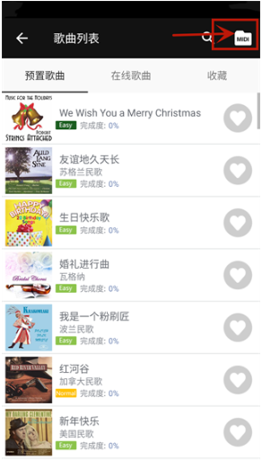 2. 紧接着进入歌曲列表页面,将目光集中到右上角,你会看到“MIDI”标识,点击该标识。