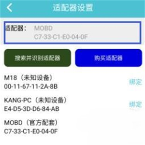 第5步:点击“搜索并识别适配器”,在搜索到的适配器列表中点击“绑定”完成适配器绑定。(搜索绑定适配器时请进入车内,将设备插在 OBD 口上,把车钥匙打在‘NO’的位置)