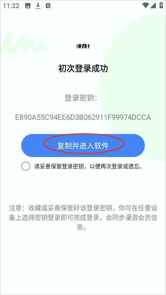 注意:收藏或妥善保管好该登录密钥,你可在任意设备上选择密钥登录即可完成登录,会同步漫游会员信息。