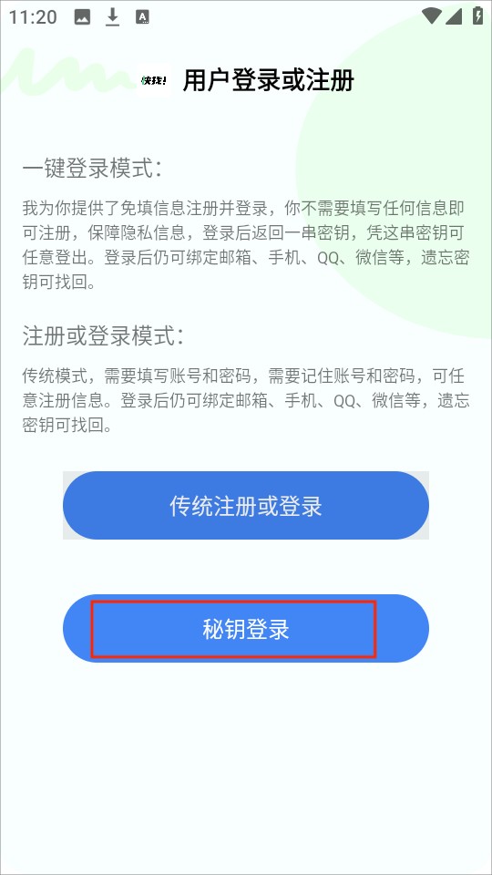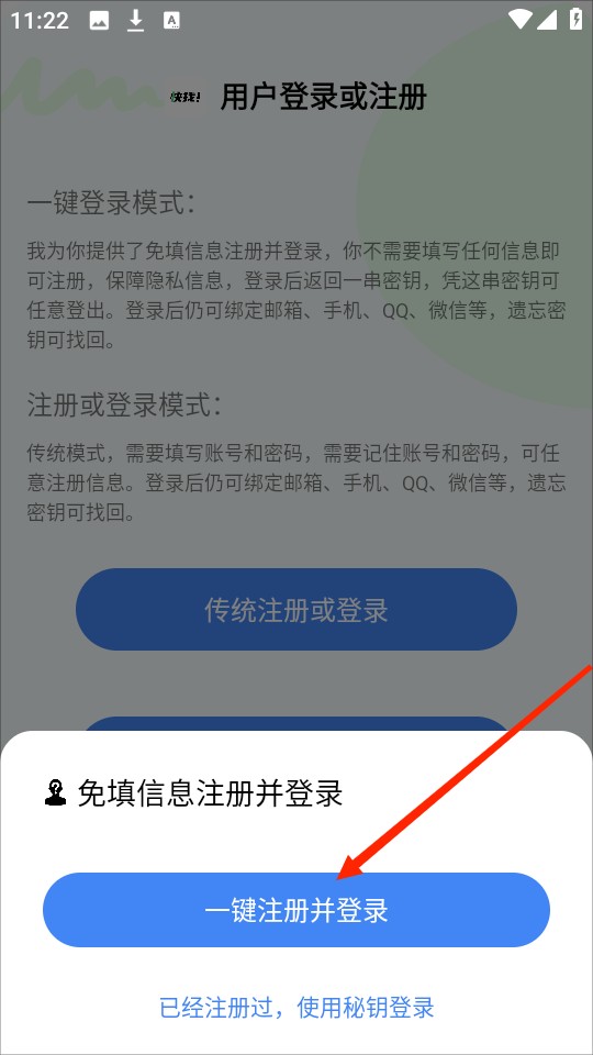 5、点击“秘钥登录”之后,直接点击“一键注册并登录”,会自动生成密钥。