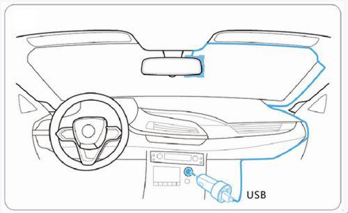 1、首先将存储用的SD卡插入行车记录仪,然后通过USB线连接车载充电器与电源线,为Wi-Fi行车记录仪通电。