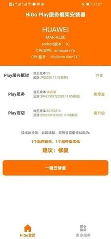 1、下载安装后打开软件,进入首页可以看到自己的手机信息,可以看到设备服务、商店、服务框架三项工具都没有安装,需要修复