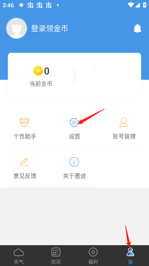 1、首先要在本站下载安装极速版的墨迹天气,然后点击进入软件我的界面点击设置。