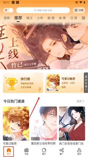1、在酷漫熊app中,大家可以通过【首页】的推荐找到当天的精选漫画,找到你想看的漫画;
