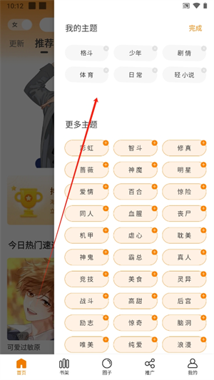 2、在首页的最上方会按照你所选择的题材推荐展示快捷分类入口,点击【三】可以编辑主题;