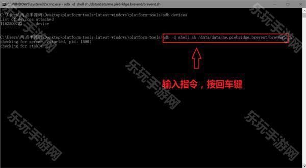 10、当手机设备出来之后,输入“.adb -d shell sh /data/data/me.piebridge.brevent/brevent.sh”完成授权。