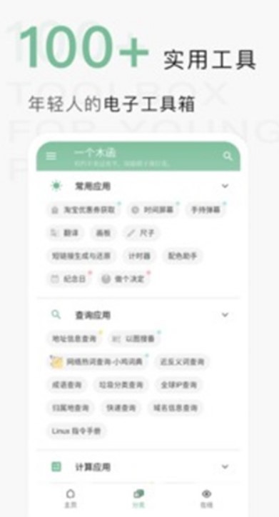 一个木函下载安装是一款提供100多个实用工具的多功能工具箱,涵盖各种小工具,免费使用,优惠券获取、时间屏幕、手持弹幕、翻译、纪念日、地址查询、以图搜图、网络热词查询、成语查询、快递查询、计算工具、数学计算、图片处理、拼接裁剪等,有需要的朋友不要错过了。