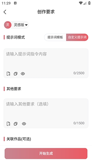 3、然后选择提示词模式,输入原文内容内容和要求,点击开始生成即可。