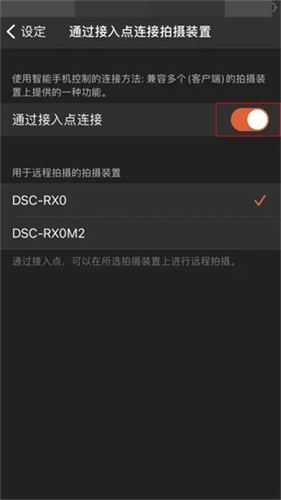 2、在“设定”界面中,点击选择“通过接入点连接拍摄装置”。