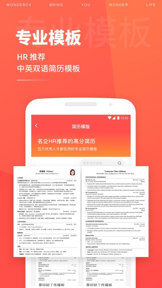 学生零经验找实习、校招、全职、跳槽各行业专业模板,多种专业化的内容可以进行了解,由来自投行咨询、BAT、以及各大500强名企的顶级导师团队联手打造,用专业的简历模板为你的职业发展护航。