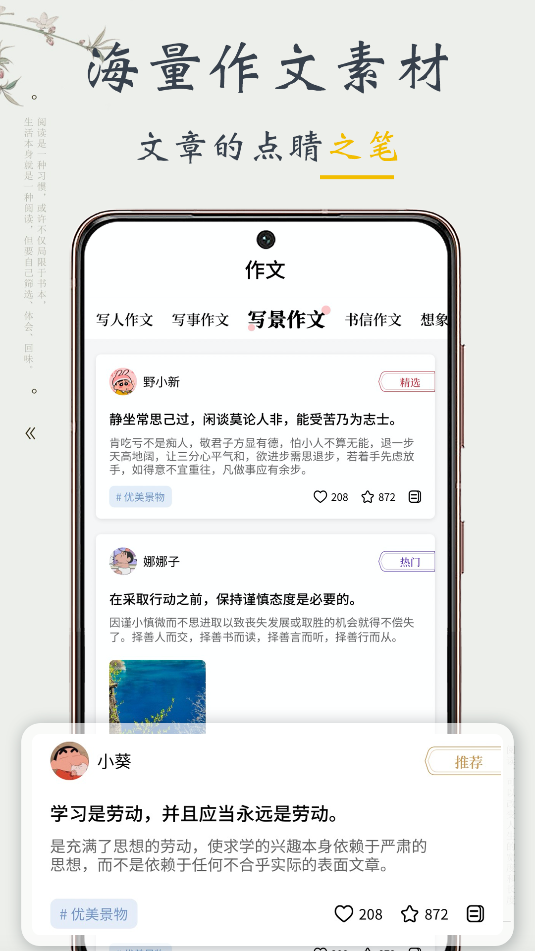2、佳句卡片可以随时随地收藏,摘抄、学习、运用,来到素材库,感受文字之美,特别好用。