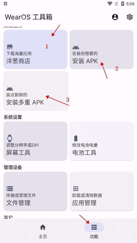 1、使用工具箱连接好手表之后,点击功能栏,第一个是洋葱商店下载,第二个是安装本地apk,第三个是多重apk。