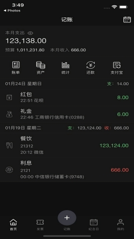 3、可以随意添加消费记录,支持支付宝、微信等类型的消费发票,掌握每月消费动态。