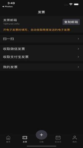 2.【发票】:一键导入支付宝.微信的发票信息;发票邮箱自动收取各种发票;扫描二维码下载发票
