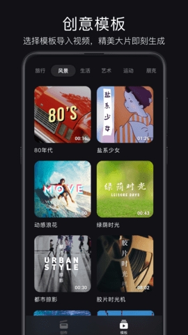『丰富的创意模板』热门视频模板、VLOG、航拍、旅行、卡点视频模板、萌娃、生活、艺术、照片模板等不同风格视频模板,总有一款适合你。
