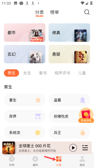 3、应用的分类界面,顶部有分类榜单涵盖都市、修真等多样类别,分男生、女生等频道,还有重生等细分题材。