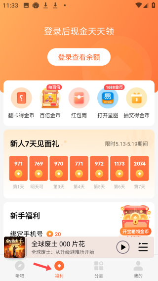 2、应用福利页面,显示登录后现金天天领,有多种得金币玩法,如翻卡、抽奖等,还设新人7天见面礼与新手福利活动。