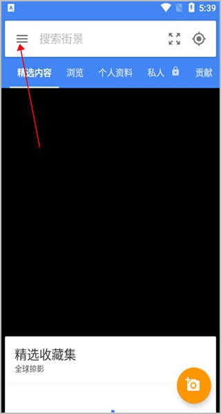 1、在本站下载安装谷歌街景地图,打开后首先可以在上方搜索街景,单击左上角三杠进入菜单;